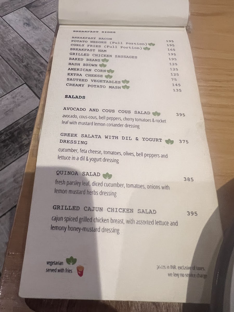 Welcome to Another Fine Day Cafe, a charming spot nestled at Level 1 of South Point Mall in Gurugram. This café is designed for leisure, offering an inviting atmosphere where families can unwind while their children play in the adjacent area. The menu celebrates fresh ingredients and vibrant flavors, with highlights including the refreshing Avocado and Cous Cous Salad and Grilled Cajun Chicken Salad priced at ₹395.00 each. Delve into their delightful spring offerings like Veg Ratatouille with CousCous or indulge in a hearty Pulled Chicken Sandwich. Breakfast enthusiasts will be pleased with their all-day breakfast options, featuring crispy Hash Browns and savory Grilled Chicken Sausages. Pair your meal with excellent coffee served in traditional kettles or try their unique fruit salads. It's truly a delightful food experience, filled with warmth and laughter.